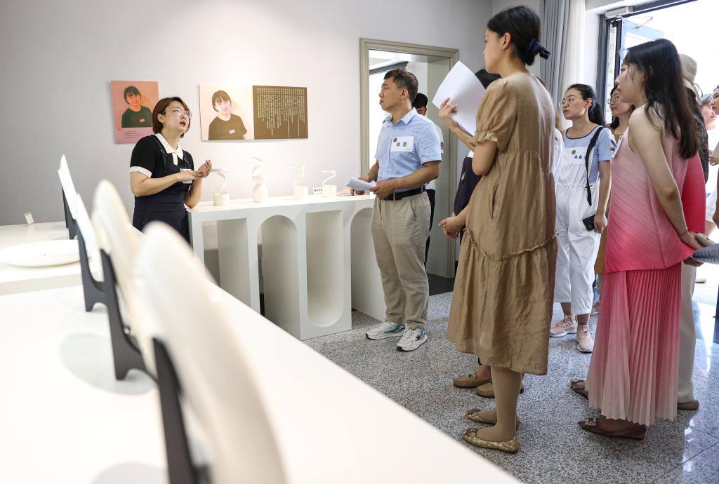 活动中,瞿佳宁主要介绍了陶艺作品《生长的方式》,深入浅出地阐释了该作品所表现出的双层次丰富内涵、动静交织变化生长、个人风格彰显等深刻艺术思维,激发了与会人员对抚顺市非物质文化遗产——大官窑陶瓷制作技艺的学习了解与探寻热情。在瞿佳宁引导下,大家参观了创新创业学院大官窑陶瓷工作室主任、抚顺大官窑陶瓷制作技艺代表性传承人王永亮教授及团队的作品展览,零距离感受东方雅韵的独特魅力和不同艺术作品的匠心独具,为学校有这样的高层次艺术家而自豪,为沈工在文化传承创新中的担当与远见点赞。