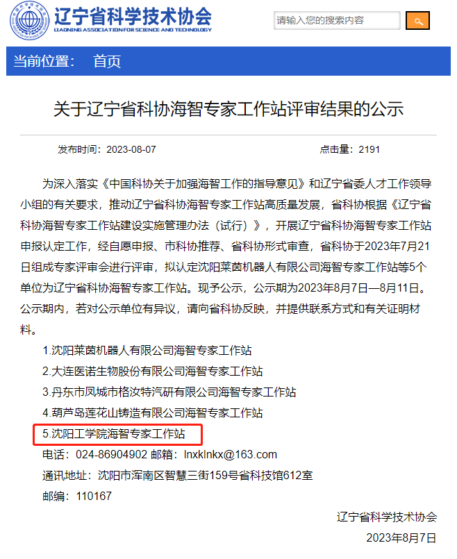 近日,辽宁省科协公示了2023年辽宁省海智专家工作站评审结果,我校申请的沈阳工学院海智专家工作站成功获批。