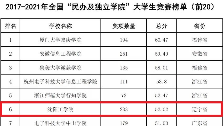 2022年2月22日,中国高等教育学会高校竞赛评估与管理体系研究工作组发布2021全国普通高校大学生竞赛分析报告,我校位列2017-2021年全国“民办及独立学院”大学生竞赛榜单第6名(辽宁省第1名),在2017-2021年全国新建本科院校大学生竞赛榜单中位列第41名(...