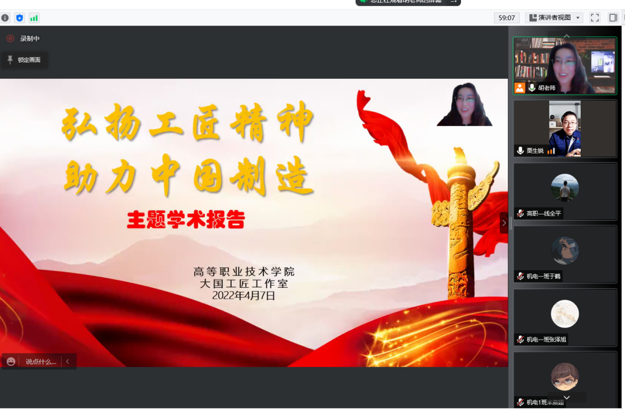 4月7日,高等职业技术学院大国工匠工作室在线上举办“弘扬工匠精神 助力中国制造”主题报告会。全国人大代表、全国技术能手、全国五一劳动奖章获得者栗生锐围绕先进数控加工技术等内容作报告。副校长兼高等职业技术学院院长邵玉参会并讲话。高等职业技术学...