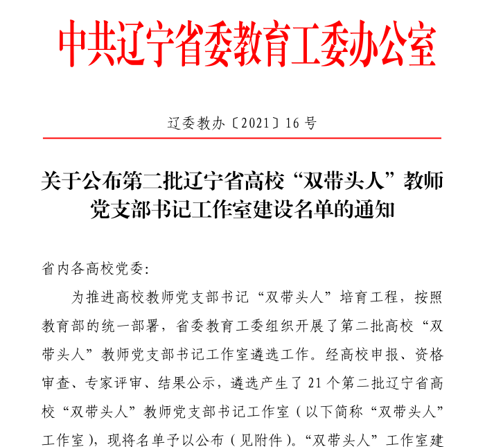 近期,辽宁省委教育工委印发《关于公布第二批辽宁省高校“双带头人”教师党支部书记工作室建设名单的通知》(辽委教办〔2021〕16号)文件,我校经济与管理学院教工第一党支部书记工作室(以下简称“工作室”)入选第二批辽宁省高校“双带头人”教师党支部...