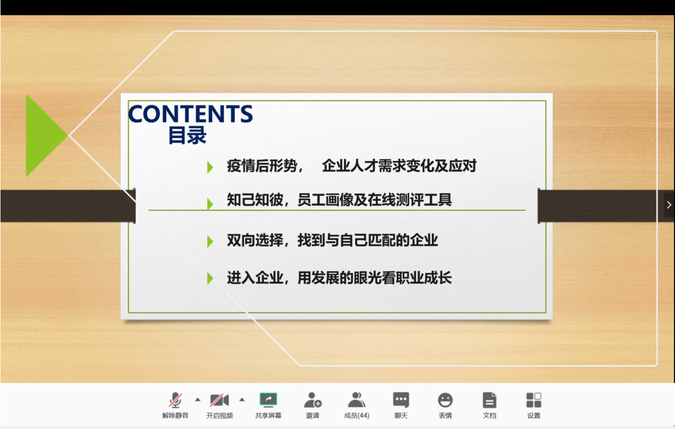指导教师就目前毕业生就业情况进行了分析,详细剖析疫情后企业的人才需求变化。并强调,面临当前的新形势和新困难,同学们要努力克服此次黑天鹅事件对就业产生的不利影响,建议大家多投简历、选准行业、双向选择、做好持久战准备、适应新方式、充分利用网络资源,了解就业信息与政策,实现更充分更高质量的就业。随后指导教师站在企业的角度从认知能力、情绪能力、岗位胜任能力和3C领导能力进行员工画像,生动形象地让同学们认知了企业对员工的能力需求,并让同学们对自身的优势有更深入的了解,根据自身需求和特点,找到与自己更加匹配的企业。最后指导教师带领大家用一生的长度看职业生涯,希望大家能将目光放远,厚积薄发。期望同学们在疫情期间,把控好时间,储备知识技能。希望测绘工程专业的第一届毕业生心情好、生活好、工作好,未来的事业好,能够大展宏图。